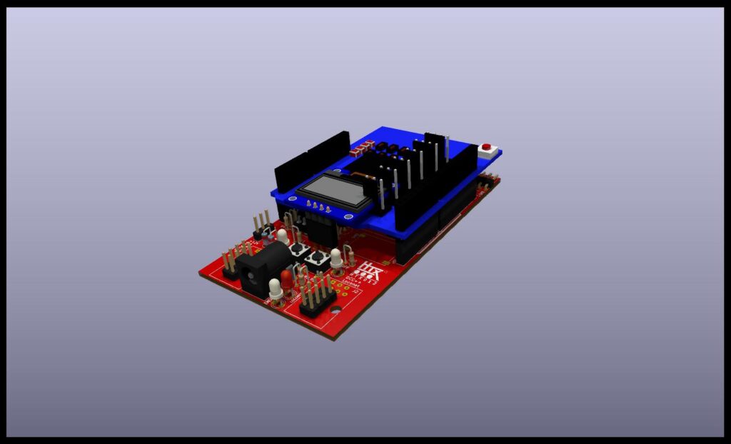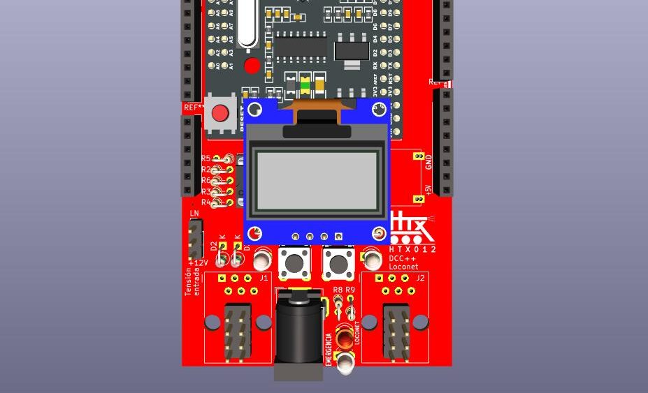 En la versión anterior, simplemente adaptaba la placa al concepto de central digital DCC++, es decir, el arduino mega, encima el MotorShiels debidamente adaptado (cortando la entrada Vin) y luego incluyendo la HTX012 con su conector RJ12.
