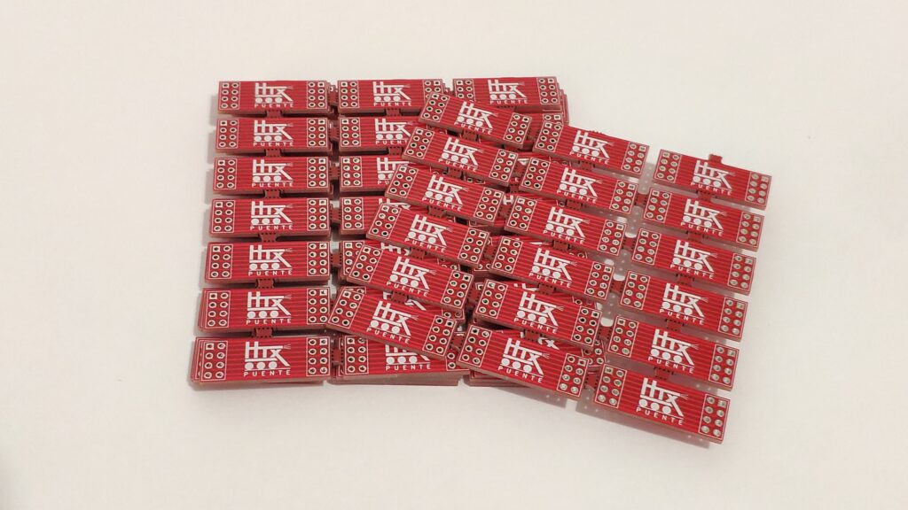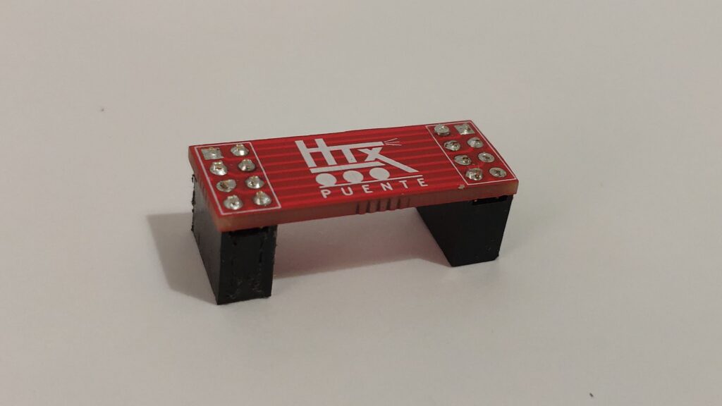 También se pueden conectar todas las placas seguidas e independizarlas eléctricamente aún usando el HTX – Puente. Solo habría que dejar sin soldar los pines de arriba, con lo que sólo quedarían conectados los pines de la señal Loconet. Es lo mismo que si le ponemos un cable Loconet nada más.