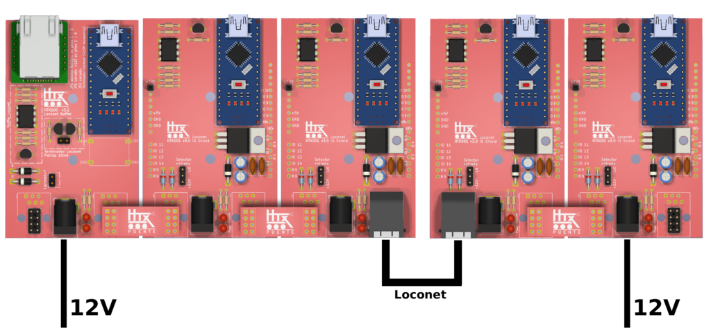No tiene complicación en su diseño, tan solo es un extensor de las líneas Loconet más un par de pines que comparten la tensión a 12V que se puede obtener desde cualquier placa de la familia HTX. Bien desde la HTX100 – Locobuffer vía ethernet, o bien desde cualquier placa a la que le pongamos un conector externo de 12V.